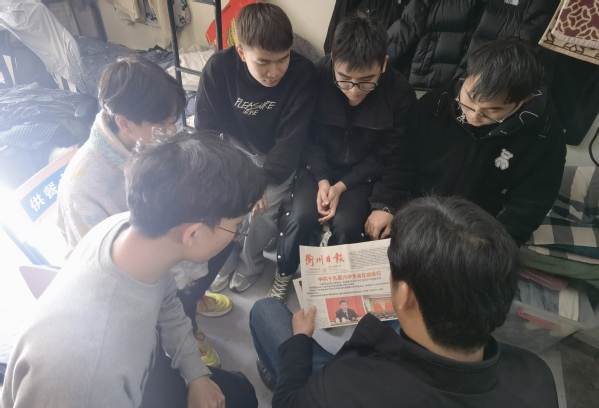 11月26日中午,后勤保卫处党支部全体党员走进联系寝室开展党的十九届六中全会精神宣讲活动。